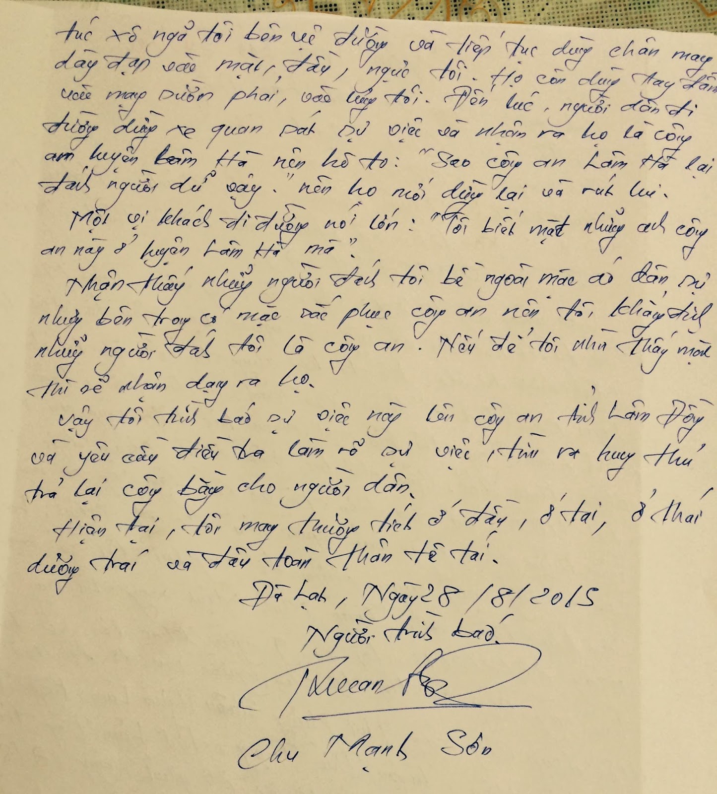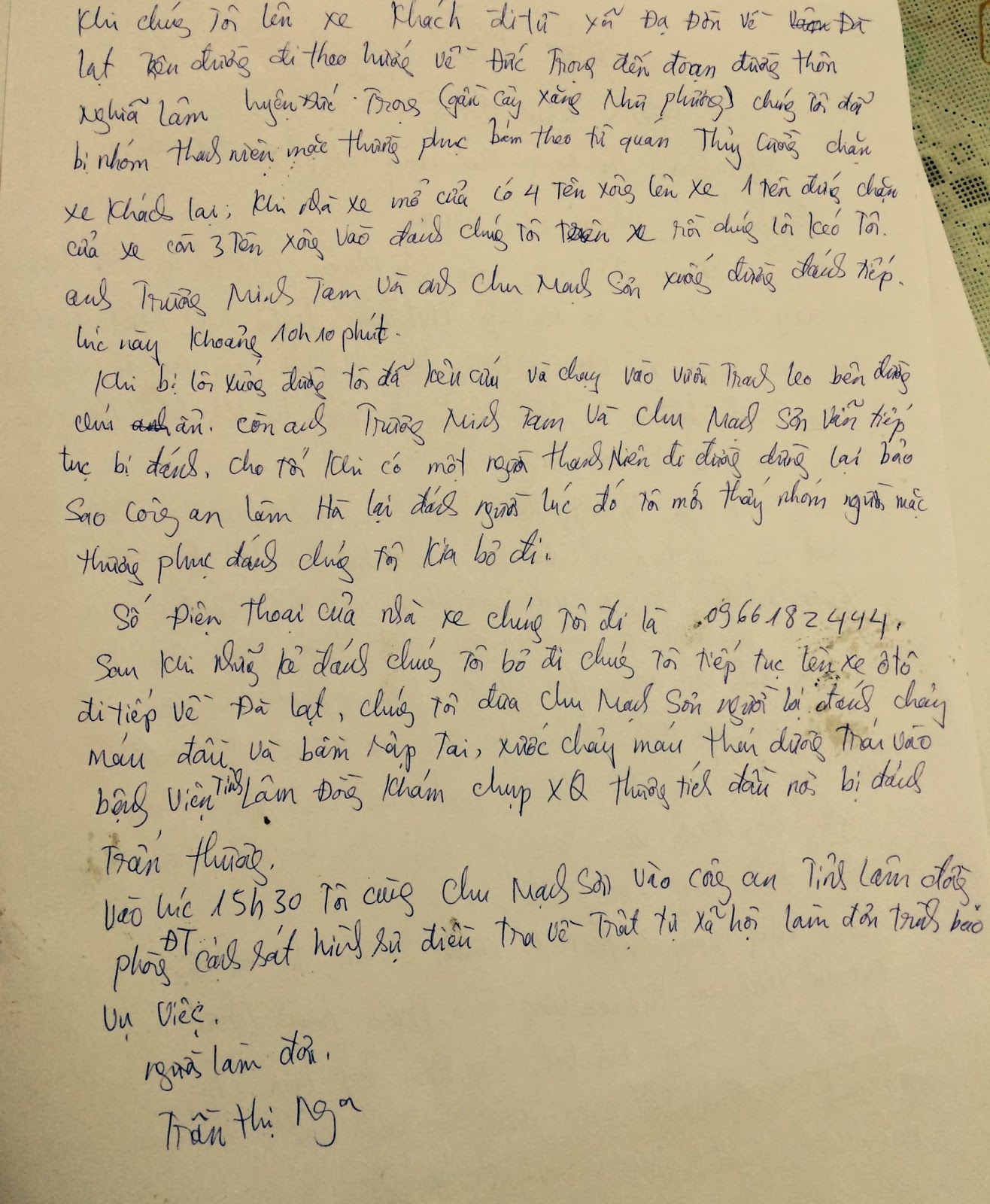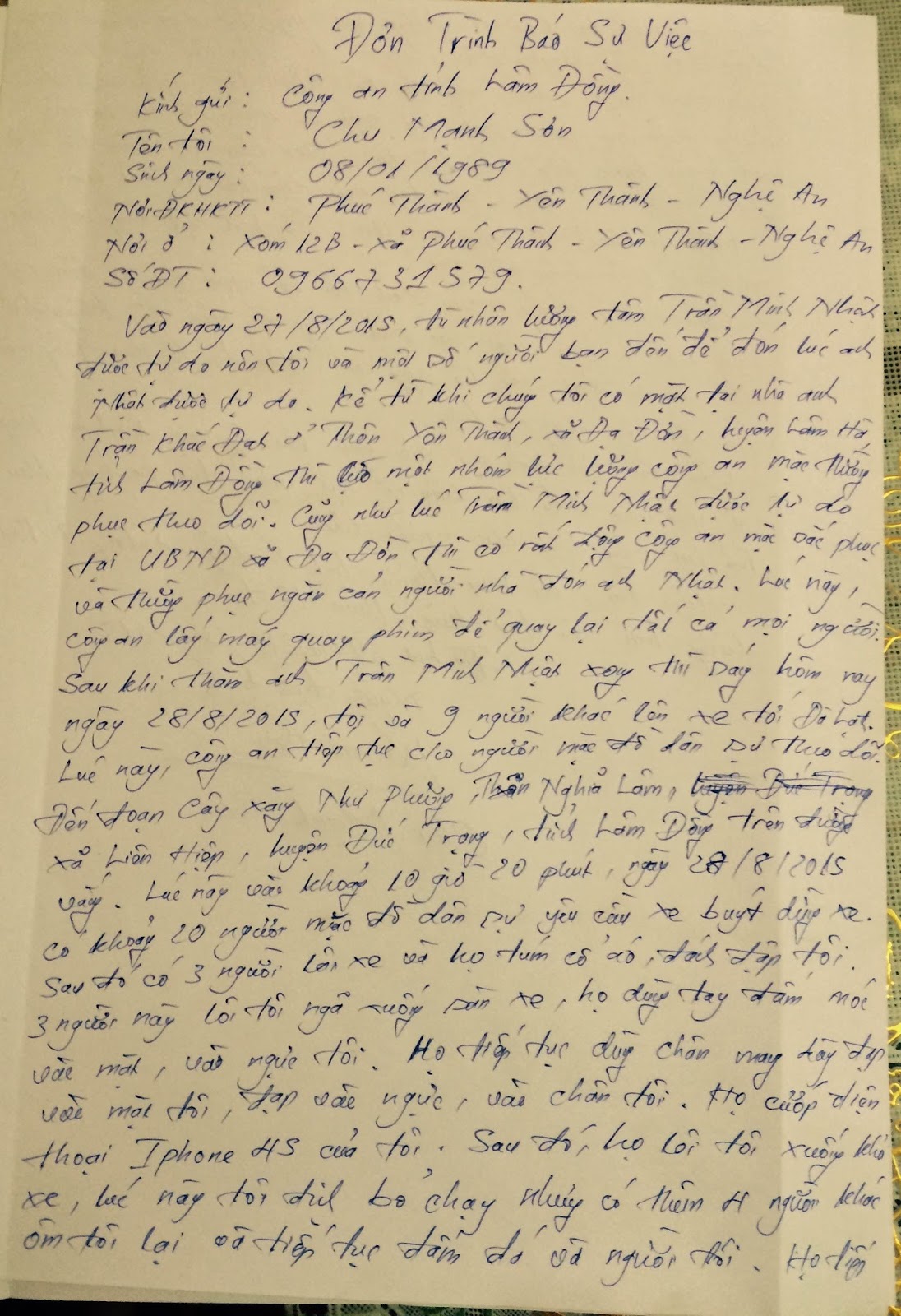 Vào lúc 15h30 tôi cùng Chu Mạnh Sơn đến phòng điều tra hình sự công an tỉnh Lâm Đồng làm đơn trình báo vụ việc chúng tôi bị đánh. Người công an trực ban tên Nhữ Hồng Dư mã số 598511 cùng 3 người công an mặc thường phục đã tiếp nhận đơn của chúng tôi nhưng không chịu viết giấy nhận đơn, không dám cho chúng tôi biết tên tuổi chức vụ.