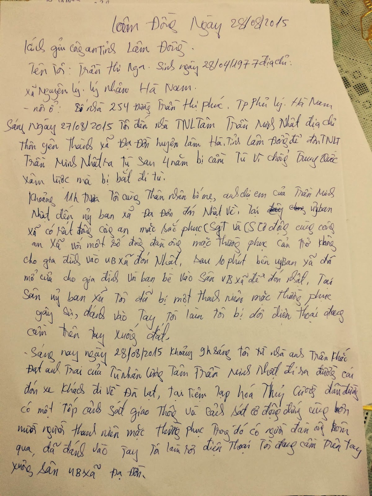 Trần Thị Nga - Sáng ngày 28/8/2015 tôi cùng những người bạn sau một ngày vui chơi với gia đình TNLT Trần Minh Nhật mới mãn hạn tù trong vụ án nổi tiếng 14 thanh niên công giáo, tin này bị bắt năm 2011 tại xã Đạ Đờn huyện Lâm Hà, tỉnh Lâm Đồng. Hơn 9h sáng tôi cùng anh Trương Minh Tam, cựu TNLT Chu Mạnh Sơn, cựu TNLT giáo sư Phạm Minh Hoàng, cựu TNLT Nguyễn Văn Oai, cùng vài người bạn ra đường đón xe về Đà Lạt vui chơi ngắm cảnh rồi mỗi người lên xe về một nơi.