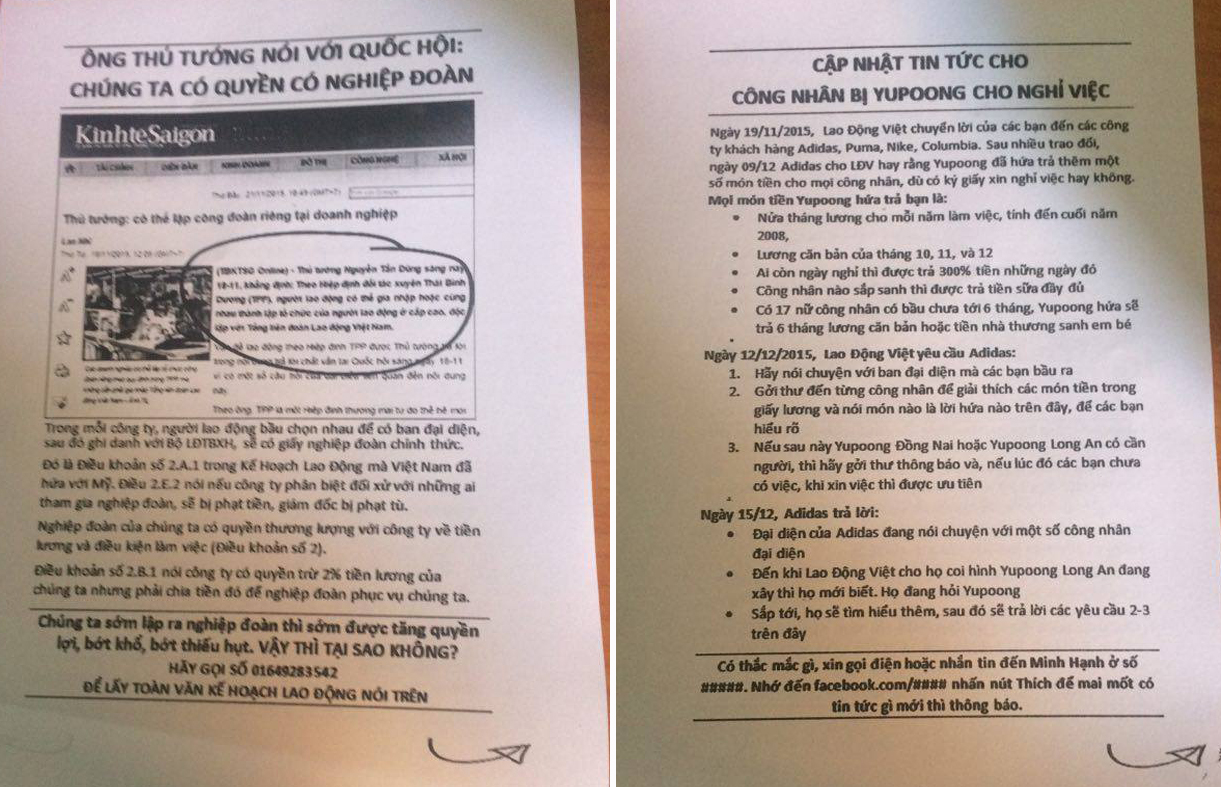 Mặt sau của tờ rơi cập nhật một số thông tin về nỗ lực đấu tranh của Lao Động Việt nhằm đòi lại quyền lợi chính đáng cho các công nhân công ty Yupoong.